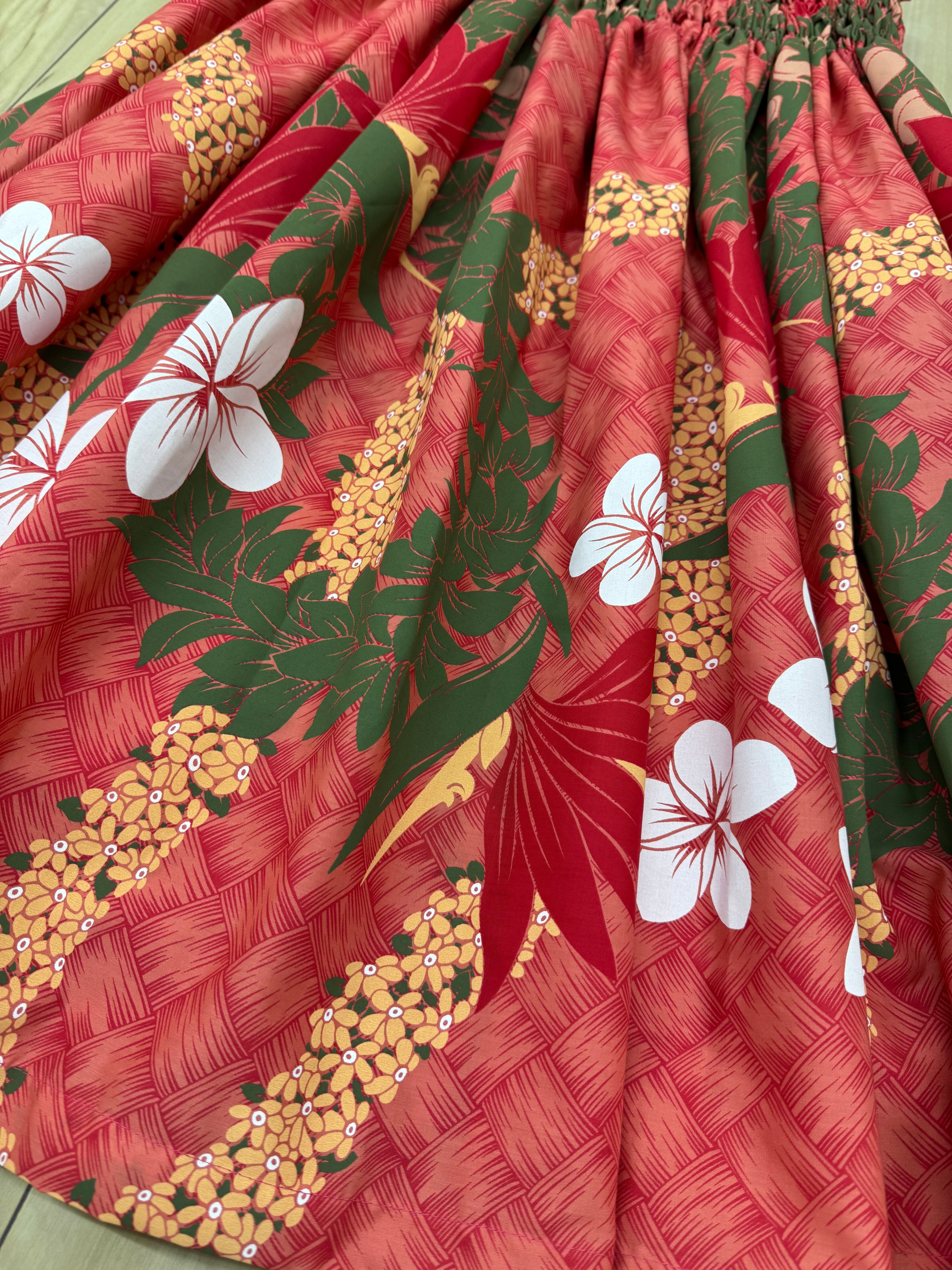 ピンク気味の赤にレトロなハワイ柄のおしゃれで素敵なパウスカートです